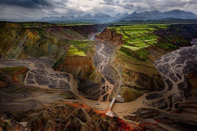 奎屯河从谷底穿越而过,加上千万年的雨水冲刷,在沙砾石堆积的下切河谷悬壁上留下了密布如织的冲沟,细沟,切沟,冲沟布满了长达几十公里的河谷槽壁,谷底平展开阔,河滩上砾石遍地,流水时合时聚,谷地右侧的水渠顺谷延伸,构成一幅美丽画图,是摄影家从事创作的摇篮,也是新疆旅游胜地