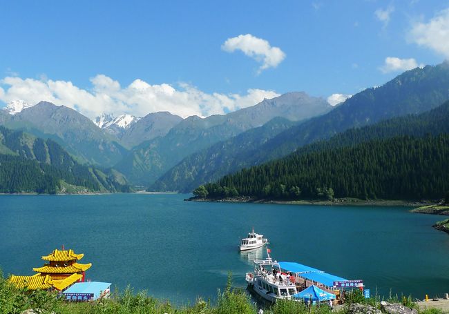 天山天池既有峨眉之秀,又显华山之雄,更有别具一格的美,湖水清澈,晶莹如玉,清纯怡人;<br/>