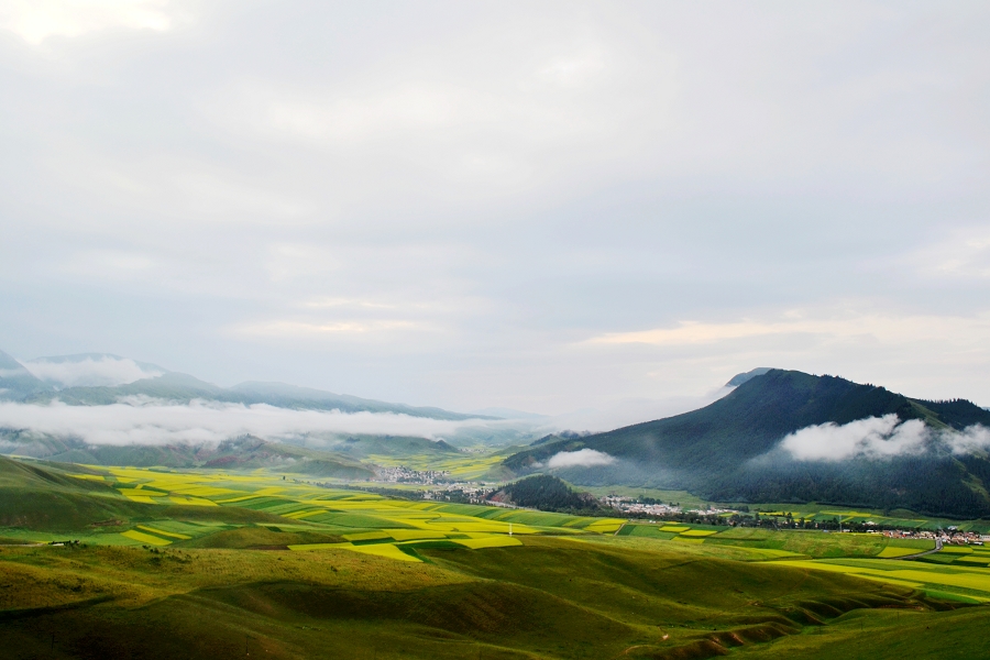 鸟瞰门源万亩油菜花海,远方耸立着雄伟的祁连山脉,岗什卡雪山白雪皑皑,万亩油菜花海就在祁连山和达坂山之间绵延不绝的铺开,气势磅礴的天然画卷震撼人心;村落、草原、花海、清真古寺尽收眼底