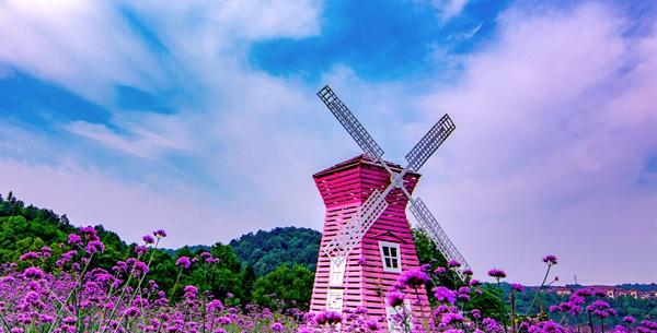 漫步七千亩原生湖岸,流连欧洲风情小镇,粉色风车矗立在梦幻般的紫色花海中,清风飘来淡雅清香,瞬间让人仿佛置身于在普罗旺斯