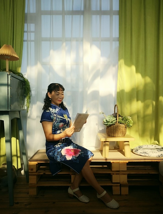张振文赋诗赞曰:素面轻描巧作妆,双目含情背依窗。小扇未摇风先至,红唇一呡暗生香。